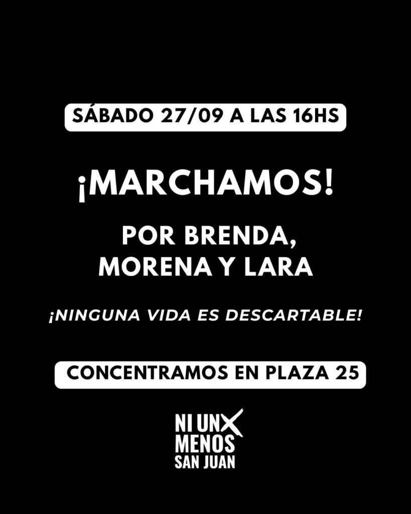 El triple femicidio de Brenda del Castillo (20), Lara Morena Gutiérrez (15) y Morena Verri (20) desató movilizaciones en más de 19 puntos del país para exigir justicia por las tres mujeres asesinadas en Florencio Varela. El horror encendió la bronca, como aquel junio de 2015, cuando tras el asesinato de Chiara Páez se organizaron las primeras marchas de Ni Una Menos en 80 ciudades de Argentina. En San Juan, el repudio al triple femicidio se expresó con una asamblea de emergencia en el Parque de Mayo, organizada por Ni Unx Menos San Juan. La próxima convocatoria es el sábado 27 a las 16 horas, en la Plaza 25 de Mayo.