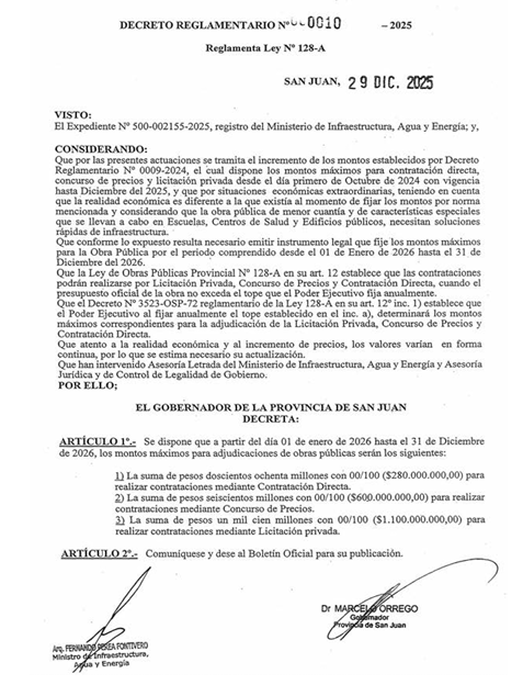 El Gobierno de San Juan estableció nuevos montos máximos para la adjudicación de obras públicas en la provincia. La medida reglamenta la Ley de Obras Públicas Provincial N° 128-A, que habilita al Poder Ejecutivo a fijar cada año los topes presupuestarios de acuerdo con el tipo de contratación.