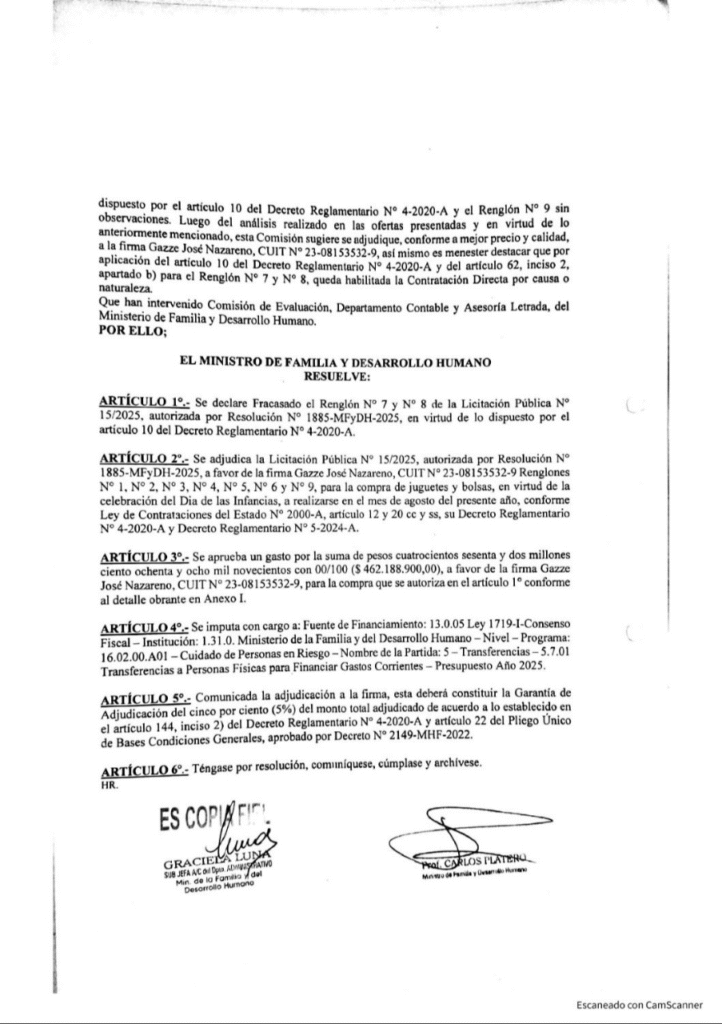 Meses después, a través del Ministerio de la Familia y Desarrollo Humano, el Gobierno destinó a la compra de juguetes, juegos y golosinas para el Día del Niño $462.188.900 al mismo proveedor. Con eso, José Gazze fue beneficiado con $1.147 millones en menos de un año.