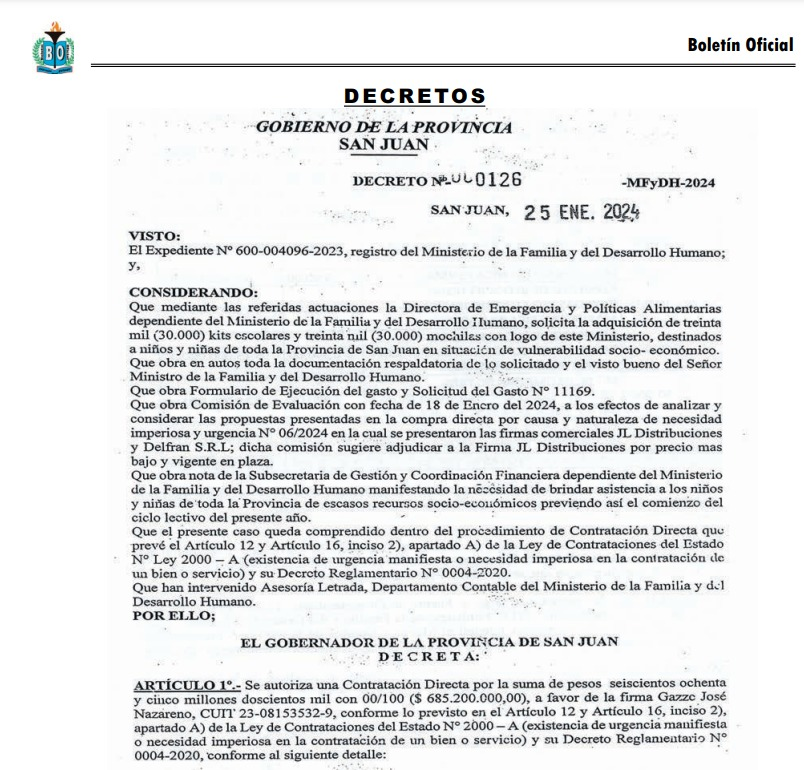 La cifra es difícil de explicar: 465 compras directas en poco más de dos años, por un total de $4.794.159.559,54, a un mismo empresario. La Mecha accedió de forma exclusiva a una denuncia penal presentada en San Juan por Pablo Alberto Firmapaz, que expone la «la sugestiva y extravagante concentración de compras directas al mismo proveedor por el Estado».