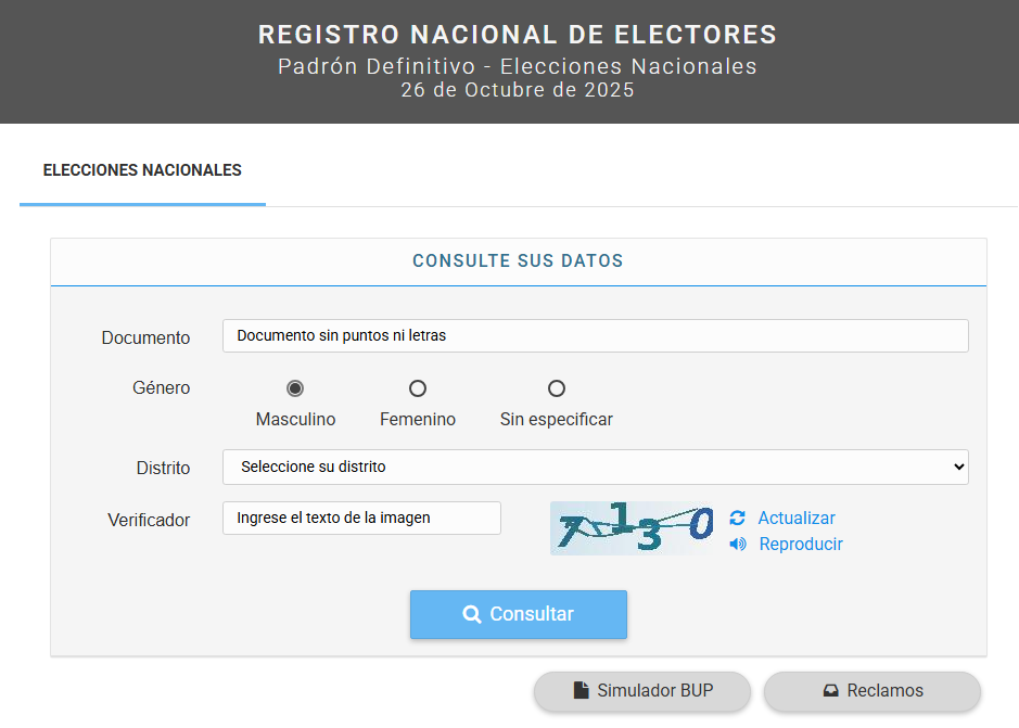La forma más sencilla es entrar al sitio oficial www.padron.gob.ar. Una vez allí, el sistema pide cuatro datos básicos: número de DNI (sin puntos), género que figura en el documento, distrito (en este caso, San Juan) y un código verificador.