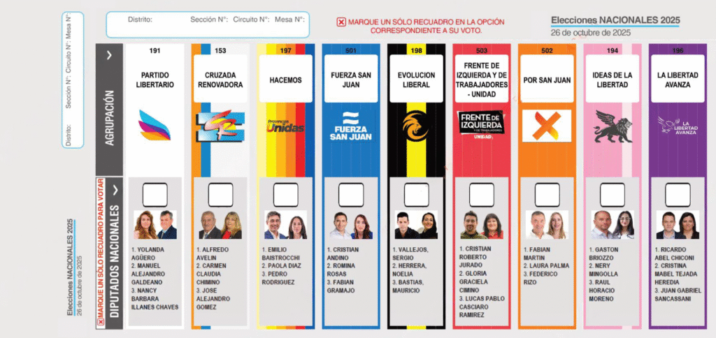 El mecanismo es sencillo. Al ingresar al cuarto oscuro, cada votante recibe una sola boleta con todas las listas y una lapicera. Las columnas muestran los partidos y las filas, las categorías en juego. En San Juan, solo habrá que elegir diputados nacionales.