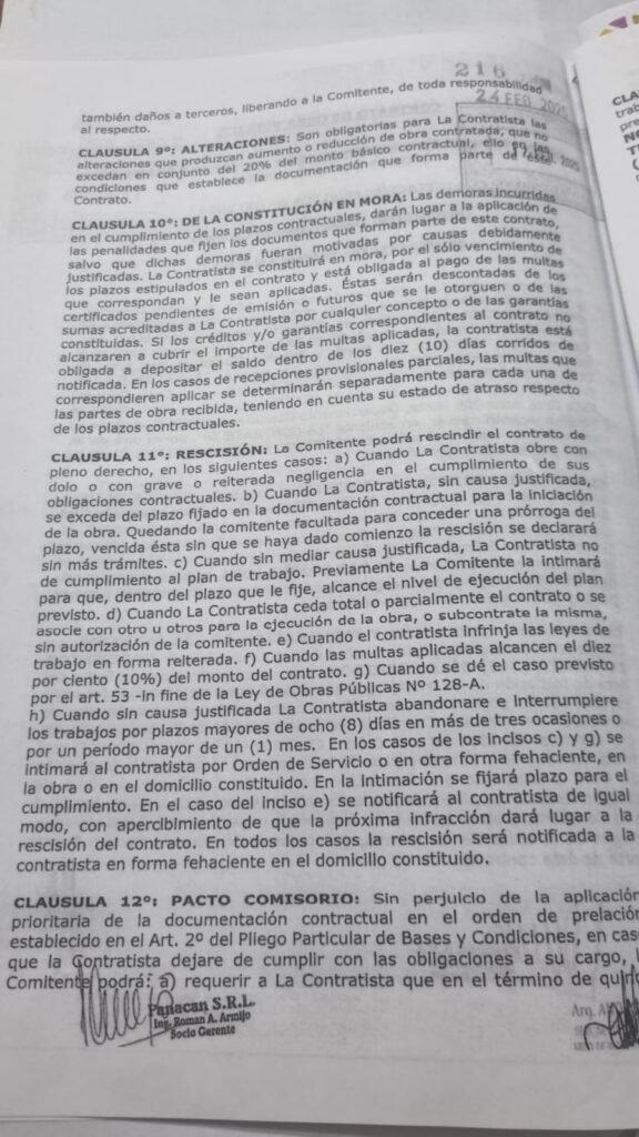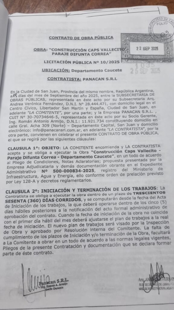 Los plazos para la ejecución de las obras van de 4 a 12 meses según la obra. Y como garantía de que van a cumplir, cada empresa tuvo que dejar depositado el equivalente al 5% del contrato —una especie de seguro que el Estado puede quedarse si la obra no se termina como corresponde. En todos los casos, quien firma en nombre del Estado es la arquitecta Andrea Verónica Fernández, subsecretaria de Obras Públicas de la provincia.