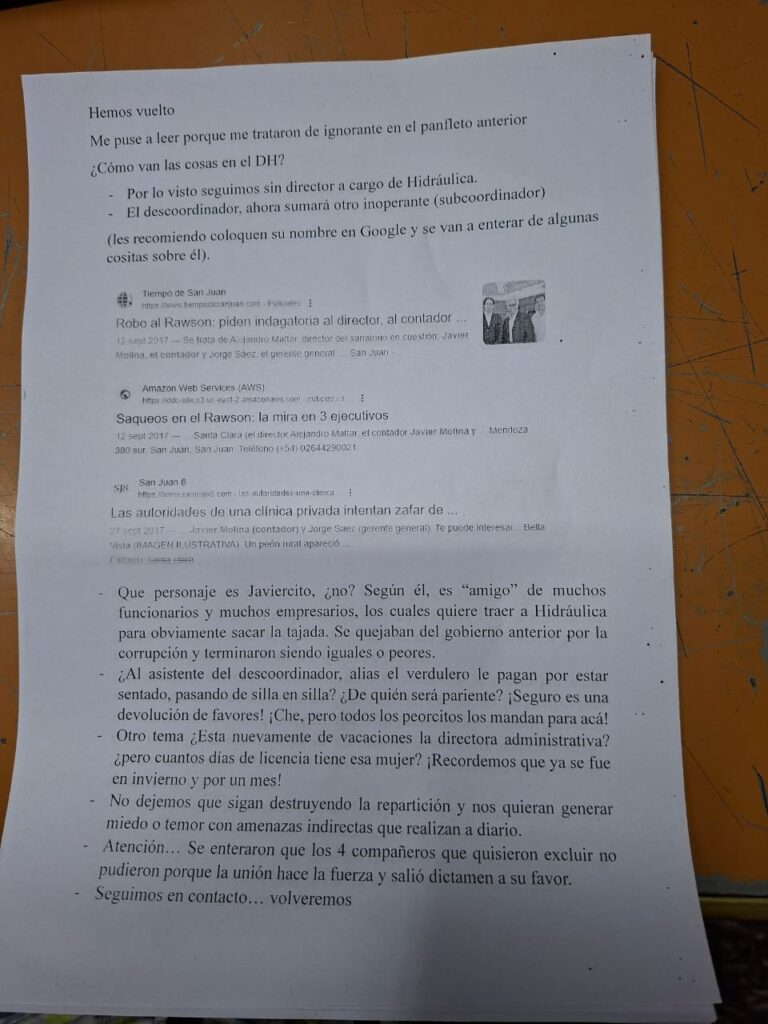 El comunicado comienza con la frase “hemos vuelto” y culmina con “volveremos”. Así, el pasquín denuncia, a través de capturas de titulares de medios, que Molina tiene antecedentes en una causa de hurto de material quirúrgico del Hospital Rawson. En ese momento, era el contador de la Clínica Santa Clara, justamente donde se habían encontrado los elementos provenientes del hospital público.