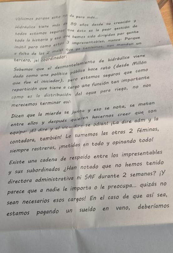 El penúltimo pasquín (se especula que apareció hace aproximadamente dos o tres meses) comienza con un tono similar al último: “Volvimos porque esto no da para más”. En esa línea, describe a la administración actual como «la peor de toda la historia» en los más de 80 años de existencia de Hidráulica. También critica al Consejo que describe como “5 impresentables con aire de caudillos”.