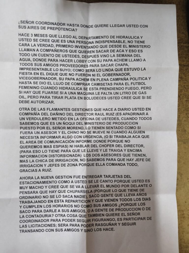 El autor anónimo también apunta contra un supuesto asistente del “descordinador”. Lo denomina “el verdulero” y lo acusa de cobrar un sueldo sin trabajar. Finalmente, la última bala del cartucho se dirige a la directora administrativa y critica su régimen de vacaciones.