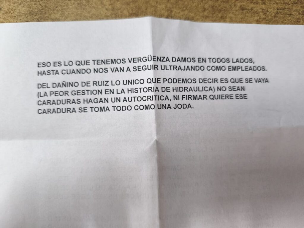 Desde hace algunos años, en el Departamento de Hidráulica existe una peculiar práctica. En ocasiones, en el edificio del organismo aparecen comunicados misteriosos, impresos y anónimos que contienen duras críticas hacia la gestión de turno.