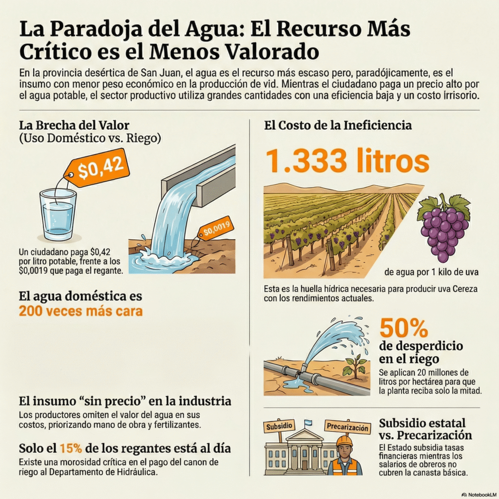 En una provincia desértica como San Juan, la paradoja económica de la vitivinicultura se hace evidente al analizar sus costos: mientras un ciudadano de Capital paga $0,42 por cada litro de agua potable a OSSE, el sector viticultor promedio abona apenas $0,0019 por litro de agua de riego. Es decir, el uso doméstico es 200 veces más caro que el riego de vid.