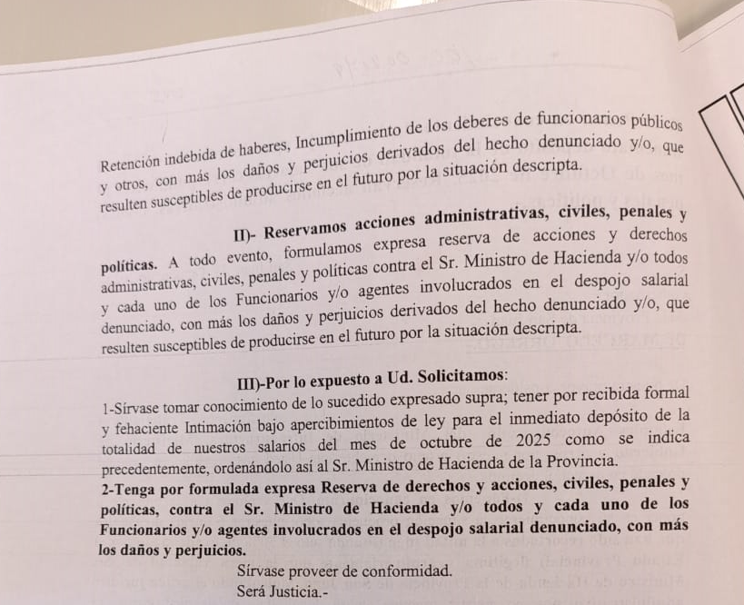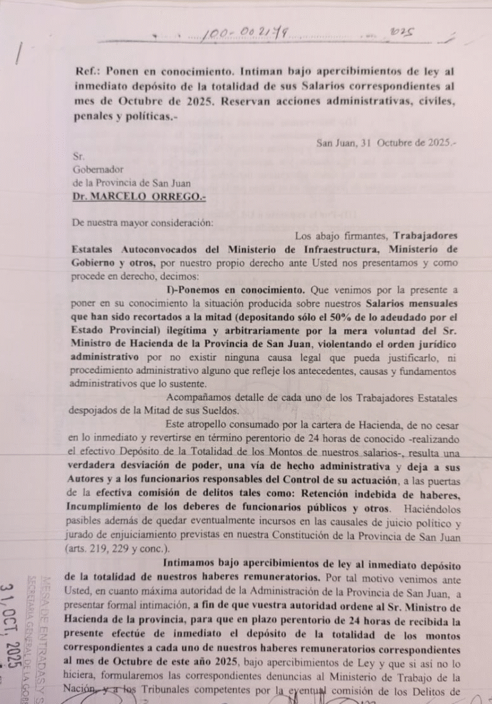 Los estatales autoconvocados formalizaron sus reclamos ante las máximas autoridades provinciales. Presentaron escritos, fechados el 31 de octubre de 2025, dirigidos al gobernador Marcelo Orrego y al vicegobernador Fabián Martín, también presidente pro témpore de la Cámara de Diputados. En ellos intiman a las autoridades a ordenar al ministro de Hacienda el depósito inmediato de los montos descontados, con un plazo perentorio de 24 horas.