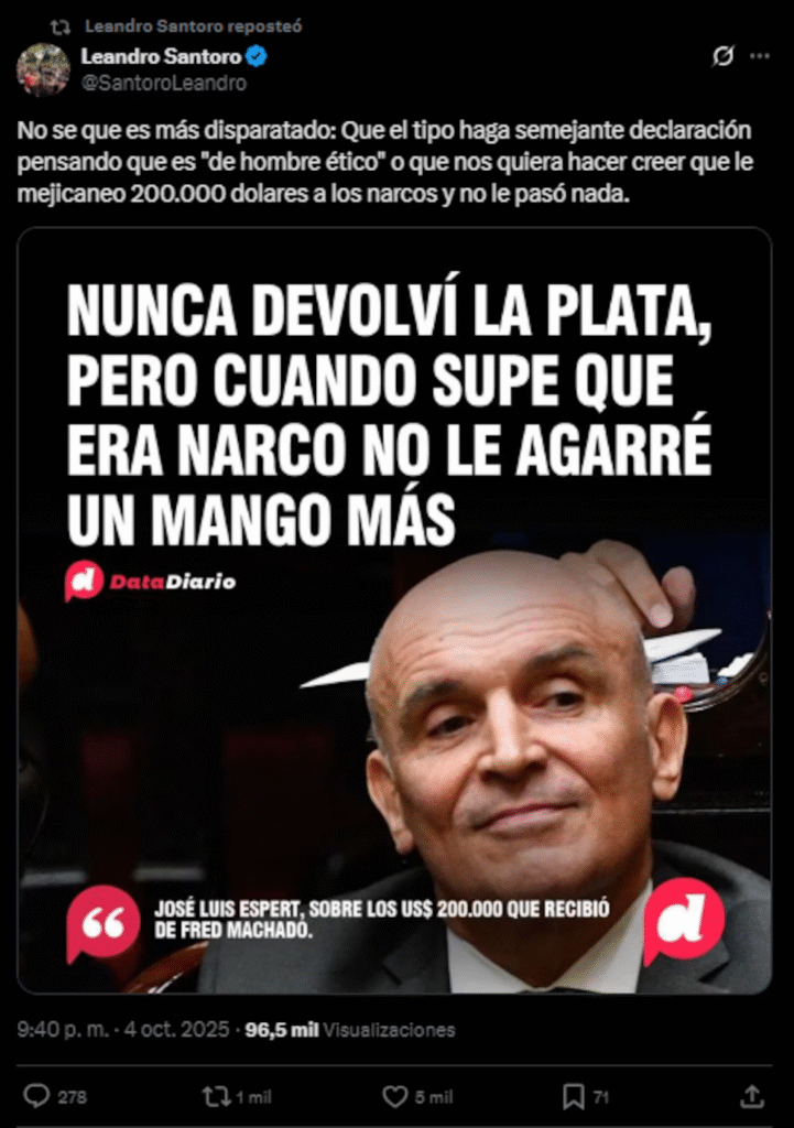 El escándalo creció cuando Espert no logró responder con claridad si había recibido o no el dinero. Aunque al principio el gobierno de Milei salió a respaldarlo, las revelaciones periodísticas y judiciales aceleraron su caída en desgracia dentro del oficialismo. Incluso el vocero presidencial, Manuel Adorni, admitió que el dirigente “probablemente tendría que dar más explicaciones”.