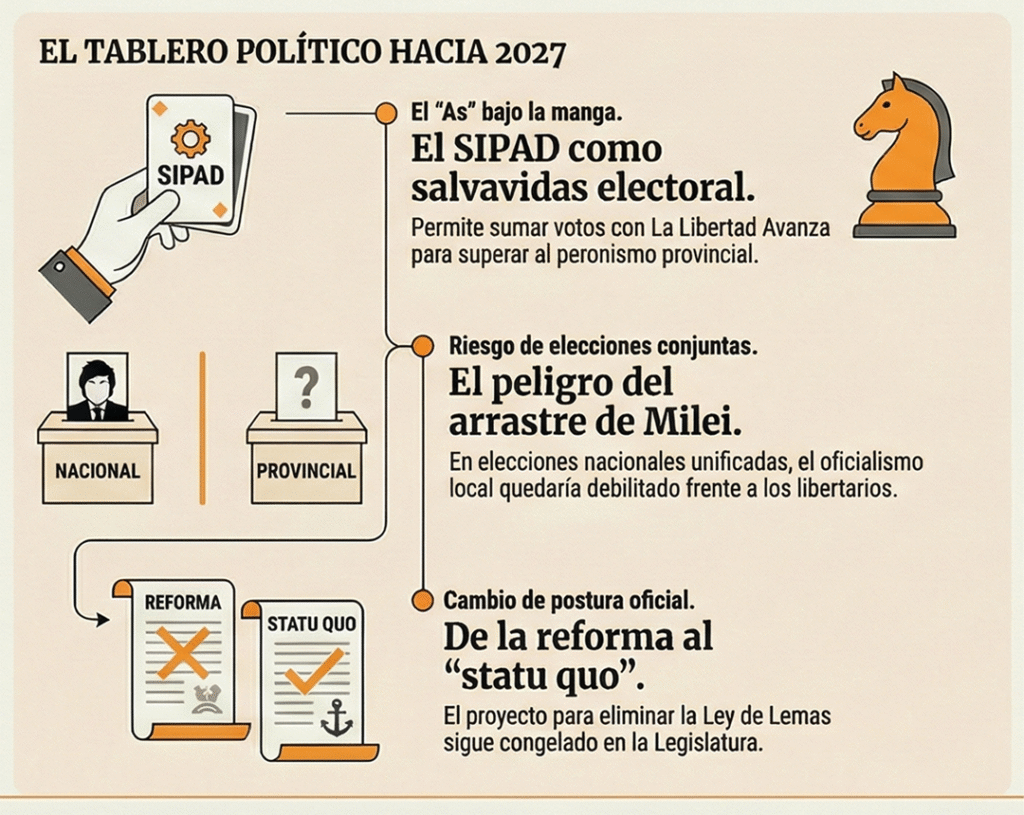 Sin embargo, tiene un as bajo la manga: el Sistema de Participación Democrática Abierta (SIPAD), duramente criticado en su momento. Si logra desdoblar las elecciones provinciales y competir bajo un mismo lema con La Libertad Avanza, incluso superándola, la suma de esos votos podría sellar la derrota del peronismo.