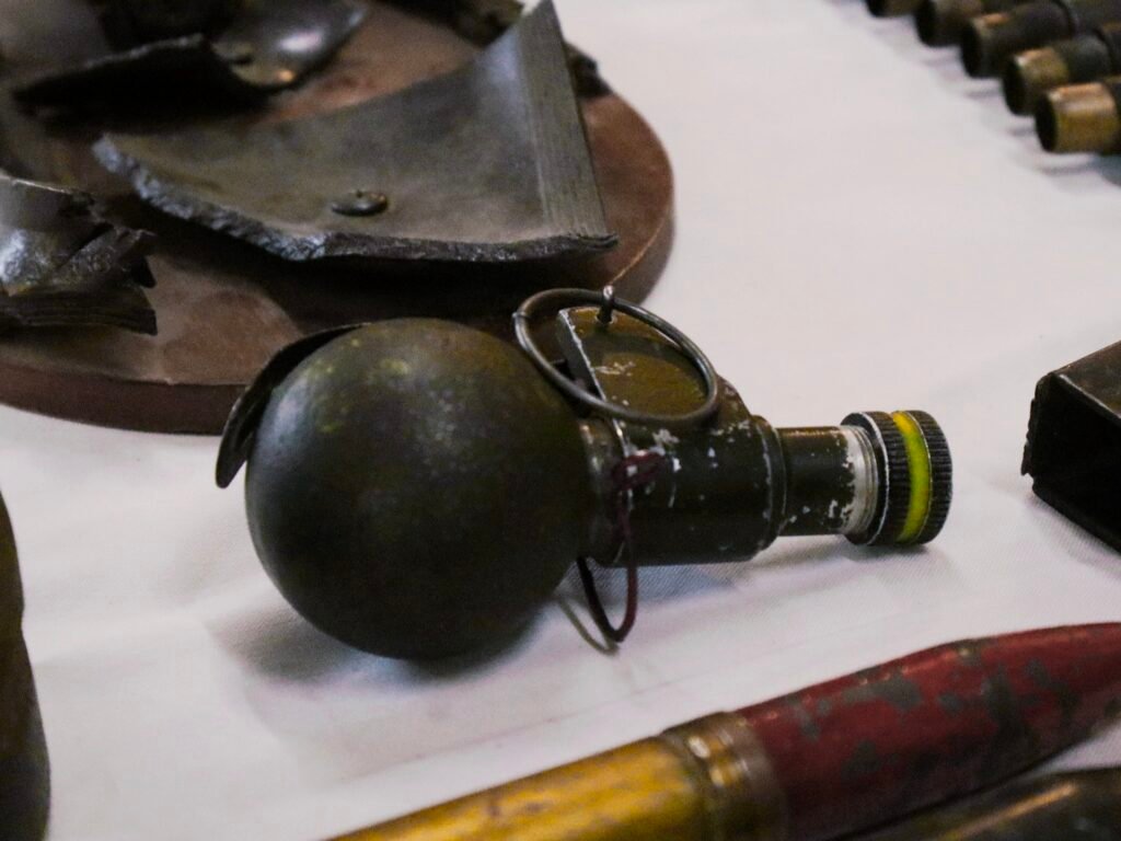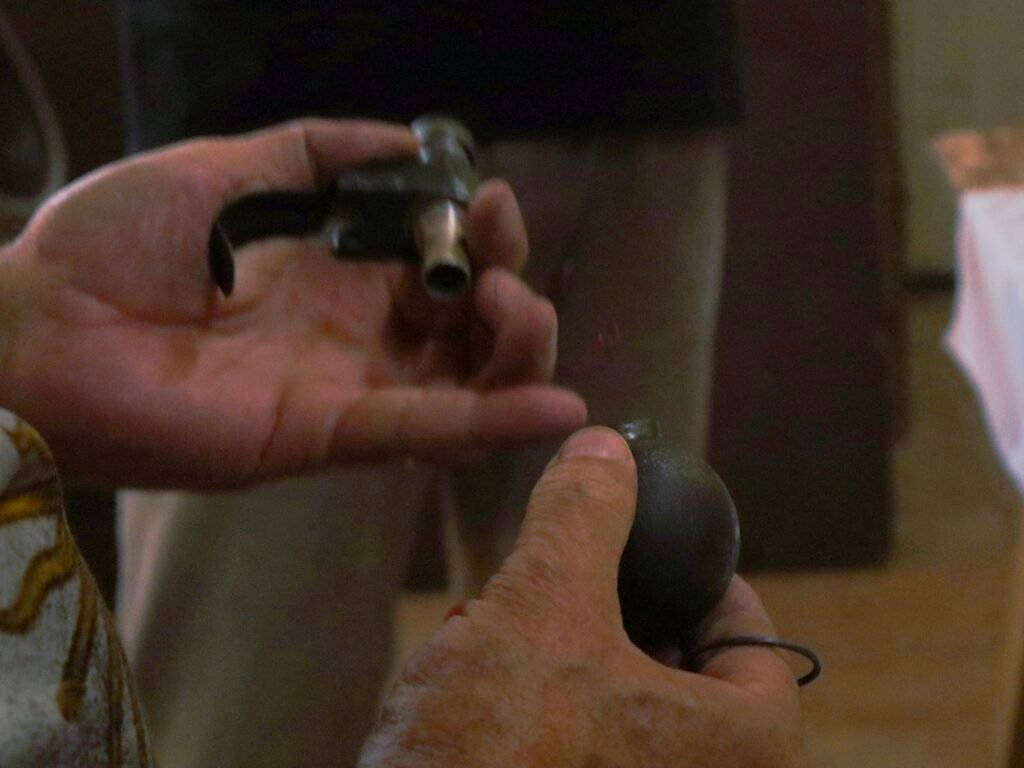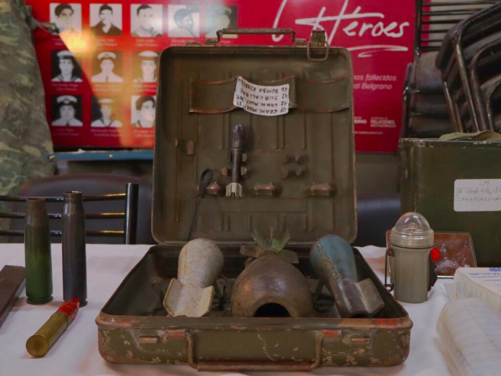 Sobre una mesa descansan municiones, morteros y fragmentos de metralla. Juan Morrone, veterano de la Guerra de Malvinas, toma una granada y la abre, sin más. Después muestra su interior. No hay trotil. Es segura.