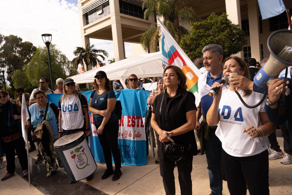 Durante la mañana de este jueves, los tres principales gremios docentes de la provincia —UDA, UDAP y AMET— llevaron adelante una manifestación en el marco de un paro de 24 horas, en reclamo de mejoras salariales. La medida de fuerza se produce tras el fracaso de las negociaciones paritarias del mes pasado y a la espera de una nueva reunión convocada por el Gobierno provincial para el próximo lunes.