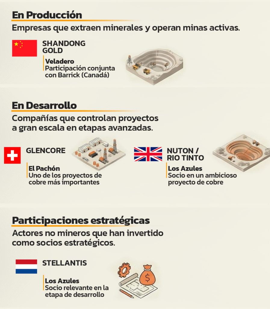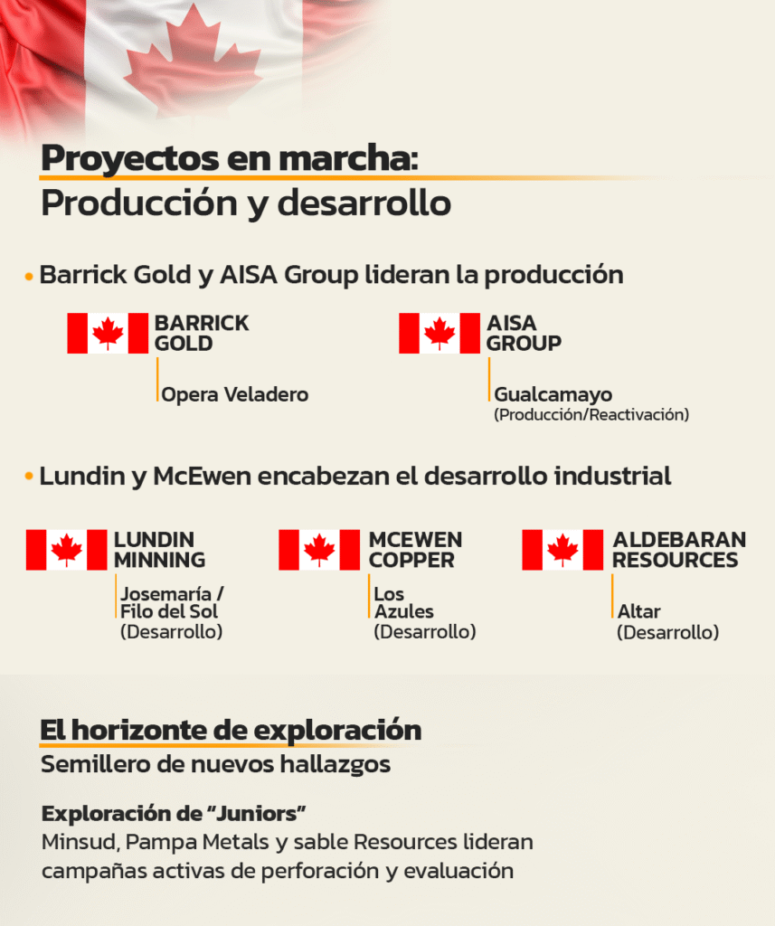 En las etapas de exploración avanzada y desarrollo, Canadá vuelve a sobresalir con firmas como Lundin Mining, socia en Josemaría y Filo del Sol; McEwen Copper, a cargo de Los Azules; y Aldebaran Resources, en el proyecto Altar. A eso se suma un entramado de empresas junior como Minsud Resources Corp., Pampa Metals, Sable Resources Ltd. y Golden Arrow Resources Corp.