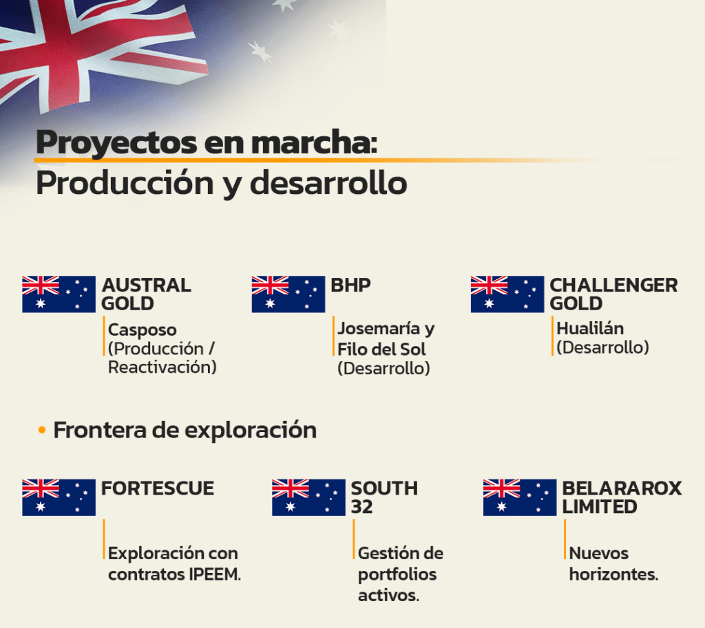 Australia, por su parte, disputa ese liderazgo con una presencia decisiva en varios proyectos estratégicos. El gigante BHP es socio clave en los emprendimientos de cobre Josemaría y Filo del Sol. En el segmento aurífero, Challenger Gold impulsa el proyecto Hualilán, mientras que Austral Gold, con base en Sídney, está a cargo de la reactivación de la mina Casposo.
