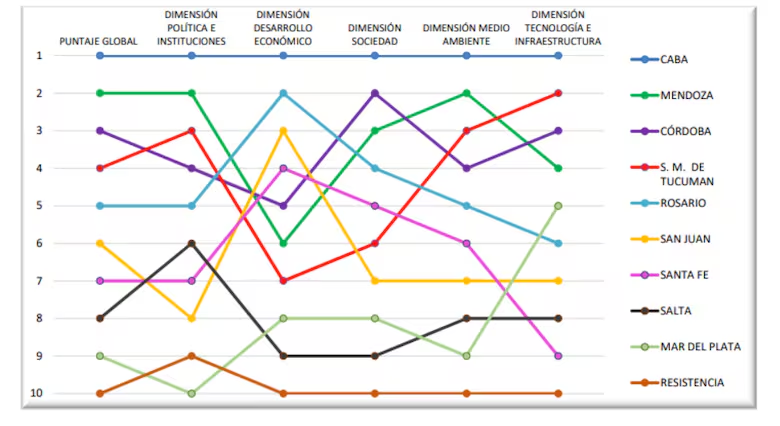La presencia de San Juan en el top 10 es significativa: pese a no estar entre las ciudades con mayores economías regionales ni densidad poblacional como CABA o Córdoba, logra posicionarse por encima de otras urbes comparables, como Salta y Mar del Plata. Sin embargo, su puntaje lo coloca claramente por debajo de los líderes nacionales, lo que indica que todavía quedan retos importantes en áreas como competitividad económica, infraestructura urbana o gestión tecnológica.