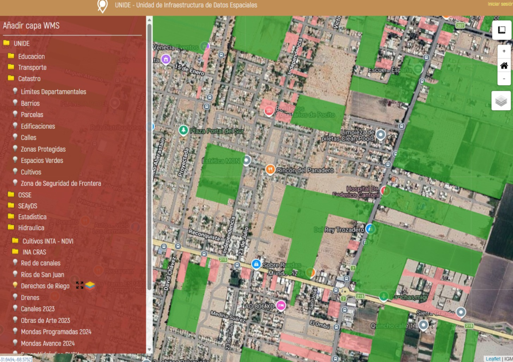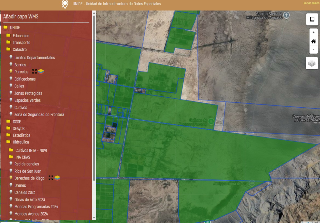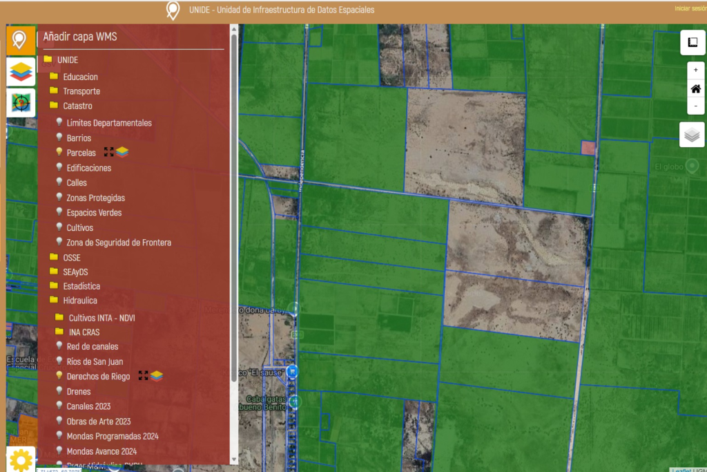 Las siguientes imágenes satelitales son de acceso público y corresponde a la web de la Unidad de Infraestructura de Datos Espaciales (UNIDE). En color verde resaltado se ven terrenos con derecho a riego y a simple vista se puede observar que no corresponden a plantaciones.
